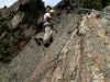 Továbbindulva előbb egy nagyon szűk hasadékon kell átpréselni magunkat, testesebb mászók jobban teszik, ha a hátizsákot maguk előtt tolva igyekeznek átjutni. A túloldalt egy rendkívül kitett traverz indul a függőleges falon (D), majd a bordát megkerülve meredeken mászunk fölfelé az élen (C-D), végül fölérünk a gerinc egy látványos kis tornyára (C). A gerinc tetején majd oldalában mászunk tovább (B-C), majd újabb kis traverz, utána rövid felszökés következik (C-D). Pár lépés gyalogló átkötést követően egy hasadékban kell függőlegesen fölmásznunk (C-D), majd újabb kitett traverzálás a fémtappancsokon (B-C), és újabb meredek mászás fölfelé, nagy mélység fölött (C). Egy kis fenyőt megkerülve jön az utolsó felszökés (C), majd a gerinc egyre inkább ellaposodik (B), majd a biztosított szakasz véget ér. Innen további kb. negyedóra gyaloglás a csúcs.
