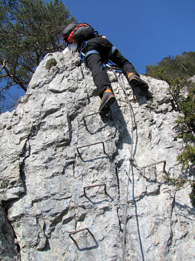 Az omlós, csúszós bevágásban felkapaszkodva – vigyázzunk a leomló kövekre! – jobbra indulunk egy széles peremen. 7-8 méteres biztosítás nélküli mászás következik (II-) lépcsőzetes sziklákon. Följebb kezdődik a drótkötél (B), amely egy széles, vízszintes peremre vezet. Végighaladunk a sziklafal alatt, majd jobbra föl kezdődik a mászás (B-C) a lépcsős sziklák, vaskampók, fenyőgyökerek között.