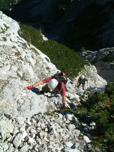 Javasolt a nyugati gerincen visszamászni a Prendnje oknóig, majd tovább a déli oldal gyalogösvényén vissza a Vršič-hágóba.