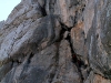 A beszállás fölött egy vízszintes párkánnyal indul az út (B), amely egy trükkös kis áthajlást (C) követően egy sziklavályúba vezet. Pár lépés gyaloglóterep, itt a mélység már jelentős alattunk, majd kb. 20 métert mászunk fölfelé tagolt sziklákon (B-C), végül egy kis párkányon elhagyjuk a kezdősziklafalat.