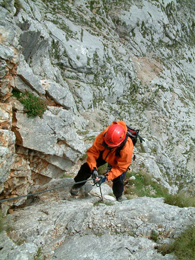 Az út csaknem harmadát kitevő mászás után megnyugtató érzéssel kapcsolhatunk rá a drótkötélre, elvégre mégis csak klettersteigre jöttünk.