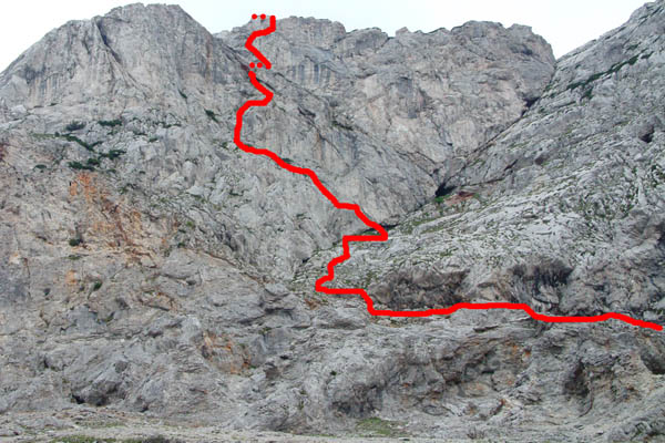 Elérve kapaszkodjunk föl a fal alatt induló enyhén emelkedő peremre, itt hamarosan megpillantjuk a helyes irányt jelző első piros fölfestést. Ezeket követve mászunk hosszan a peremen föl (UIAA I-II), majd egy bordát megkerülve, némileg kitett fordulón kapaszkodunk tovább (UIAA II). Följebb törmelékes terepre érünk, itt jobbra föl a megdőlt sziklákon (UIAA II), míg el nem érjük a balra, egy nagy, meredek párkányon induló drótkötél végét. Innen jobbra UIAA III- úton fölmászhatunk a Haidsteig Madonnájához, bár ennek semmi értelme.