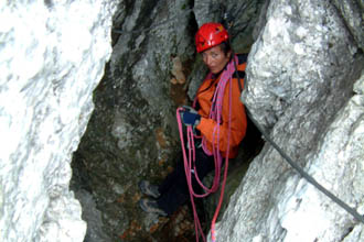 Innen újabb rámpa vezet fölfelé, egyenesen egy sötét sziklahasadék torkába (B-C). A kötél függőlegesen fölfelé tűnik el a barlangüregben, ám ha közelebb mászunk, odafentről világosság dereng elő (lámpa nem szükséges). A kürtőben pár métert nagy erőkifejtéssel hernyózunk fölfelé (E), a drótkötél laza, a falak pedig csúsznak, valamint hátizsákkal éppen hogy átpréseljük magunkat a szűkületben. Kicsit följebb sziklaperemre érkezünk, innen már jóval könnyebb az út. Szemközt ferde hasadékból árad a fény a barlangba. Átlépve a tátongó üreg fölött, ahol az imént fölmásztunk, pár lépéssel kint vagyunk a barlangból, méghozzá a sziklafal szédítően kitett szélén (C-D). Alattunk százméteres szakadék mélyül. Balra fordulva egy kissé megdöntött táblán mászunk föl (C). Följebb lényegesen könnyebb a terep (B-C). Vár még ránk egy nem túl vészes átlépés egy kisebb hasadékon, illetve fölfelé mászunk akissé meredek, oldott, hasadozott mészkő sziklákon, ahol legfeljebb a drótkötél szokatlan vékonysága okoz itt-ott problémát. Végül fölérünk a sziklatetőre, negyedóra sétára a Preiner Wand csúcskeresztjétől.