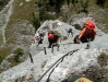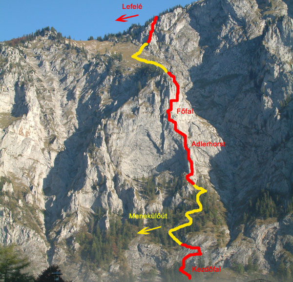 A függőleges falon vascövekekre lépkedve kissé oldalazva mászunk, (C), majd függőleges felszökés következik (C-D), amely egy, a sziklát kettészelő keskeny, földes párkányra vezet. A szédítő mélység fölött oldalt lépkedve, időnként kissé kilógva (C) jutunk túl ezen a szakaszon, majd újabb erős felszökés következik (C-D). A függőleges mászást egy bevágás fölötti kitett átlépés követi, majd azonmód nekiugorhatunk a következő meredek pillérnek (C-D). Végül egy könnyű párkány (A-B) kivezet a hatalmas, várfal szerű sziklafalból. A rétekig már csak egy kisebb erdőbe rejtett kődarabbal kell megbírkóznunk (C) az útkönyvig.