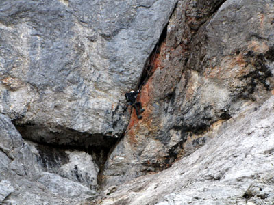 A steignek igazából két beszállása van: előbb B, B-C nehézségben mászunk föl egy afféle bevezető sziklán, ami a fal tövébe, az igazi beszállsához vezet (2240 m). Egy komor, nedves hasadékban, különös, vörös színezetű, erőse visszahajló sziklafalon indul az út (E), klasszikus példájaként a nem idevalókat „kiszelektáló” kezdetre. A vaspöckökre fölkapaszkodva és a drótkötélen erősen karból húzódzkodva gyűrjük le a bevezető métereket. A mutatvány igen nehéz, de igazából csak az első 2-3 méter igényel extrém erőkifejtést. Némi rutinnal és két jó bicepsszel nem okozhat gondot. A folytatás meredek, de egyre könnyebb (C-D), míg végül a hosszú, ferde bevágás jobb oldali falára jutunk egy szellős traverzen (C). Innen változó nehézségű kapaszkodással jutunk meredeken egyre följebb (jellemzően C, egy-egy rövidebb szakasz C-D). Följebb érve a mászás könnyebbé válik (B-C), mígnem kiérünk az út első szakaszát jelentő nagy rámpáról (Plattenrampe).