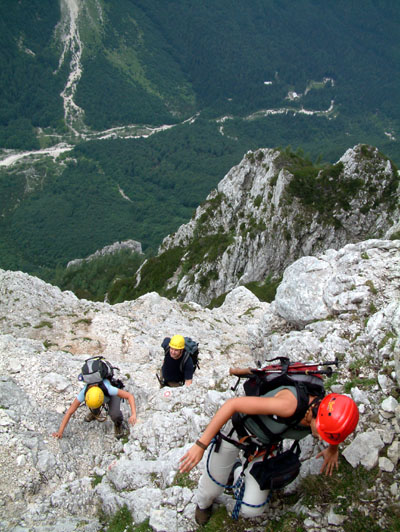 Innen hosszan kapaszkodunk tovább a drótkötél mentén, könnyű mászással (B). A fölénk tornyosuló Begunjski vrh (2461 m) csúcsáról hatalmas sziklataréjok futnak le, az ösvény ezeket harántolja. Ennek megfelelően utunk hol bevágásokba fordul, hol a kivezető oldal kitett sziklaperemein kígyózik fölfelé. Nagyon szép a kilátás a Vrata-völgyre és a Triglav főcsúcsára. Végül hosszas biztosított kapaszkodással elérjük a felső ösvényt amely egy sziklafal tövében enyhén lejtve eléri a Prag útvonalat. Innen tovább a csúcsra az ott leírtaknak megfelelően.