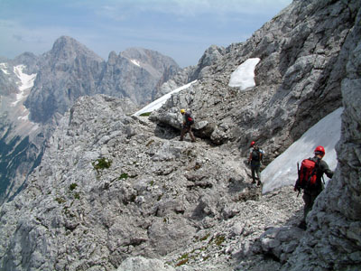 Ha nagyon elfáradtunk, vagy késésben lennénk, innen balra fordulva gyaloglóterepen visszatérhetünk a Vršič-hágóba. A túra jobbra az előzőhöz hasonlóan folytatódik a csúcs felé, az északi falon: kisebb felszökések, omladékos, sziklás traverzek, gyaloglóterepek és csúszós hómezők váltogatják egymást. A csúcs alatt az út törmelékes, meredek bevágásba fordul, amelyen fölmászva (B-C) egy szűk csorbába jutunk, amely a déli oldalra vezet. Ezen az oldalon gyaloglóterepen érjük el a csúcsot, ami innen még 20 perc.