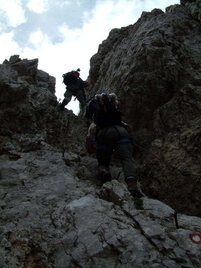 A kuloár felső szakasza meredek sziklahasadékká válik. Ennek jobb oldali, keleti falán mászunk (B-C). A biztosított szakasz kitett és egyre meredekebb (C), végül pár méteres függőleges felszökésbe megy át (C-D), ahol az elhanyagolt, lötyögő lépővasak és az omlós természetes lépések fokozzák a nehézséget. Kitett traverz (B) vezet a barlangnyílás szájába.