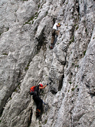 Előbb lefelé mászunk a mészkőgerinc szikláin könnyű, biztosított mászással (A-B, B), mígnem elérük azt a csorbát, amely a Groser Feistringstein sziklaormát választja el a kinyúló hosszanti gerinctől. Kicsit ereszkedünk egy törmeléklejtőn, majd egy függőlegesen induló hasadékban megpillantjuk a csúcsra vezető drótkötelet.