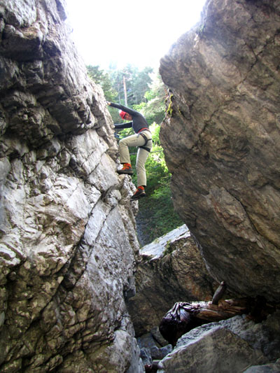 A szurdok beszűkül, a falak egyszerre fölénk borulnak. Megérkezünk az első kötélhídhoz, amely egy zúgó fölötti sziklaszűkületben vezet át a túlpartra. Ott pár lépés után meredeken kapaszkodunk föl a félelmetes, sima falon (C), majd újabb „nepáli-híd” következik, most párhuzamosan a folyásiránnyal. Ezen átimbolyogva egy ugyancsak izmos felszökés, majd kitett, némi ügyességet és erőt igénylő traverz következik (C), majd leérünk a homokos mederbe.