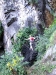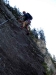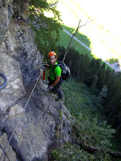 Részletes beszámoló Megközelíthetőség: A túra leírása: Tovább indulva egy szép, erdei mászás (B-C) után balra hosszú, megdőlt rámpa vezet tovább egy jókora sziklafal oldalában (B-C). Itt újabb függesztett padot találunk, majd a drót visszafelé kanyarodik és beérünk a kulcshelynek számító falba – fölnézve a réteglépcsőkön átlósan vezetett drót maga a D-E szakasz. Előbb még a falszakasz jobb oldalán kell felkapaszkodnunk (C), aztán egy szusszanás után vágjunk bele a nehezébe! A látványnak elég bizarr és ugyancsak kilógós traverz mászható erőből, talpunkat a falnak szorítva, vagy technikázva, mert kis odafigyeléssel végig találunk apró, megléphető lépéseket, illetve néhány méterenként nagyobb peremeken megállva pihenésre is van mód. A kulcshely után rövid gyaloglás következik, majd jókora, erdőbe rejtett sziklafal kerül elénk. Ez a kiszállófal. Keskeny szurdokvölgyecske mélyül alattunk, amelyen rövid kötéshíd vezet át, egyenesen a fal oldalába. A túloldalon látványos, függőleges kapaszkodással folytatódik az út (C, C-D), a tetején kisebb áthajlással (D). Fölötte rövidesen kimászunk az útból és pár szinte beesünk a Gasthaus Zimmereben teraszára. Lemenet: Megjegyzés: Mászható időszak: Menedékház: Felszerelés: