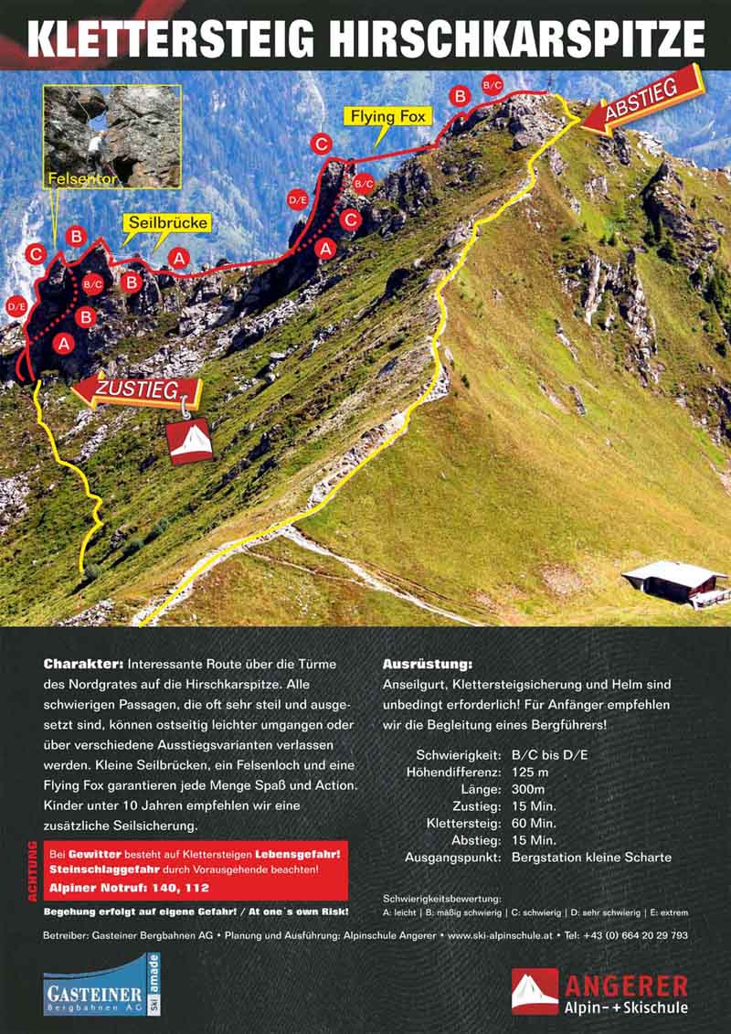 A beszállásnál a steig mindjárt kettéválik: a bal oldali az első torony oldalában B-C nehézségben éri el a torony után a gerincet, míg a jobb oldali ág kőkemény, enyhén visszahajló belépővel indít (D-E), a drótkötél mellett csak apró természetes lépésekkel kell boldogulnunk. Kicsit följebb D, C-D nehézségben és nagyon kitett falon érjük el a tornyot. Innen a steig egyszerűbb (B), de a gerinc igencsak keskeny. Becsatlakozik a könnyebb variáns, a következő kis torony és utána a két kis kötélhíd mindenkinek teljesítendő (B). Elérjünk a második nagy tornyot ahol a steig ismét kettéválik megint a baloldali toronykerülő a könnyebb variáns (C, kampók), a jobb oldali direktben tekeredik föl a toronyra (D). Mesterséges lépéseket itt se keressünk. A két útvonal ismét összefut. Következik a flying fox: kedvünk szerint átcsúszhatunk rajta a szemközti sziklagerincre, vagy felsétálunk a csúcsra az ösvényen. Ha a flying foxot választottuk, még nem túl nehéz (B-C) gerincmászás vár ránk a Hirschkarspitze (2119 m) csúcsáig.