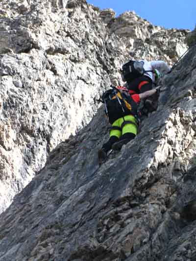 Egy meredek B-s bevezető és egy rövid B-s balra traverz után a drót meredeken, direktben fölfelé vezet a függőlegessé váló falon. Csaknem négyszáz méter mászás jellemzően ilyen lesz: meredek, kitett, esésirányban vezetett, C és D közötti nehézségű, ahol a drótkötél és a csodálatosan tagolt, peremes és kompakt szikla természetes lépései és fogásai segítségével mászunk.