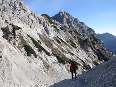 Eredetileg a Kranjska Rinka megmászása is tervben volt, de most valahogy mindketten úgy érezzük, épp elég ez mára, no és le is kell még érni. Különben is, ahhoz jó hosszan le kell ereszkedni a két Rinka közötti törmeléklejtőn, majd újra fölkapaszkodni a szomszédos hegyre. Majd máskor! Legalább lesz miért visszajönni. Hosszan botorkálunk lefelé a köves, karsztos terepen, és csaknem egy órába telik, amíg elérjük azt a kiágazást, ahol kettéválik a Rinkák és a Skuta útvonala. Innen viszont pár perc már csupán a Turski zleb lejárata. Fölmerült még a Kamnisko sedlón vezető, már kétszer megjárt út is, de mivel csak a hágót 2,5 órára írja a tábla, és onnan még 1-1,5 óra az Okraselj, inkább a kuloárt választjuk, amelyen keresztül 1,5 órára írják a Frischaufov házat.