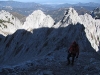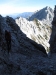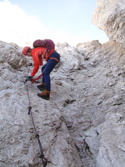 Az út egy lefutó gerincél oldalába kanyarodik föl, és pár perc alatt már kitett, biztosított traverzen találjuk magunkat. A gerinc olyan keskeny, hogy egy lyukon keresztül átkukucskálhatunk a túloldalára, abba a völgybe, ahol pár órája még fölfelé kaptattunk. Aztán omladékos peremen emelkedünk, majd a megdőlt mészkő rétegbordákat szépen követő kapaszkodás következik, hol drótkötél biztosítással, hol csak úgy, szabad mászással. Beereszkedünk egy keresztező hasadékba – három éve itt fordultunk vissza a meredek és firnes hómező miatt. Most ez is száraz, de a szakadékba vezető törmeléken való áthaladás nem túl bizalomgerjesztő. Följebb újra biztosított szakasz következik, meredek felszökések, míg a lábunk alatt többszáz méteres mélység tátong. Végül egy kisebb csorbába mászunk föl, ahonnan meredek, omladékos, de legalább biztosított bevágás vezet föl egyenesen a csúcsra.